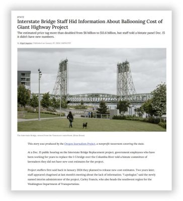 “At a Dec. 15 public hearing on the Interstate Bridge Replacement project, government employees who have been working for years to replace the I-5 bridge over the Columbia River told a bistate committee of lawmakers they did not have new cost estimates for the project,’’ Jaquiss reported. “Project staffers first said back in January 2024 they planned to release new cost estimates. Two years later, staff appeared chagrined at last month’s meeting about the lack of information.’’