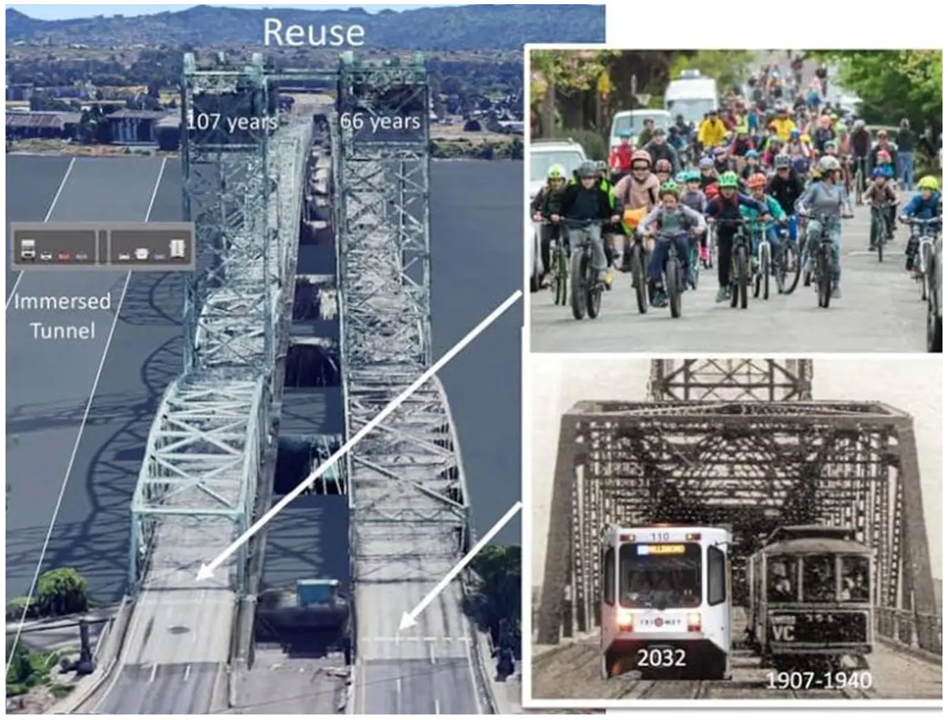 As for any future Light Rail extension, ITTs are used for subway, metro, and light rail systems. An example is a 3.6-mile immersed tube tunnel is Bay Area Rapid Transit (BART), which runs under San Francisco Bay. An expansion of light rail to Vancouver can be included in the ITT’s original design or by adding additional ITT modules later. Repurposing the I-5 bridge also provides an additional option for Light Rail as several vehicle lanes on the Interstate Bridge can be repurposed for Light Rail. A repurposed Interstate Bridge also allows bike & pedestrian traffic to cross the Columbia without a steep 90ft climb to reach IBR’s mega bridge.